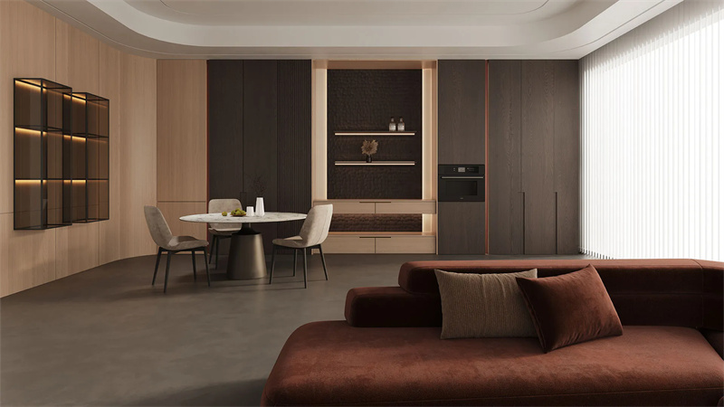 这类板材原料优质、工艺复杂,环保性和耐用性极佳,质感出众,价格偏高,适合预算充足、追求天然质感和高端格调的家庭,适配原木风、新中式、轻奢等高端装修风格,多用于存放高端红酒、洋酒等需要精细保护的酒品,兼具储酒和高端展示功能。